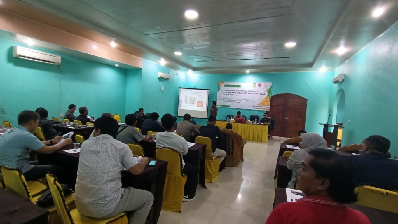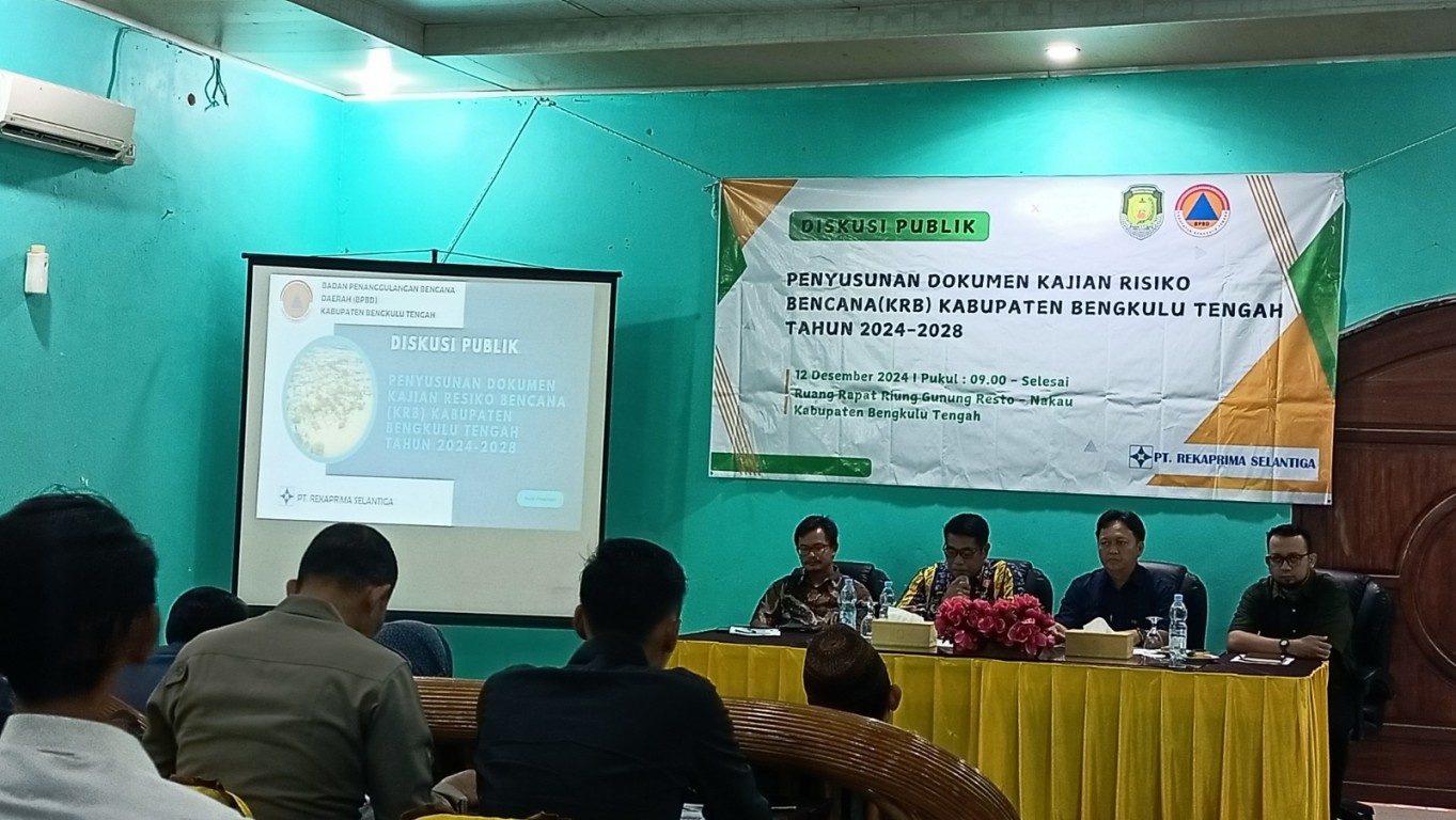 Bengkulu Tengah – BPBD Kabupaten Bengkulu Tengah melaksanakan kegiatan Diskusi Publik Penyusunan Dokumen Kajian Risiko Bencana (KRB) Kabupaten Bengkulu Tengah Tahun 2024 dilaksanakan di Riung Gunung Resto, Desa Nakau, Kec. Talang Empat, Kabupaten Bengkulu Tengah, Jumat (13/12/2024). Acara dibuka oleh Kalaksa BPBD Benteng, Harmen Junaidi, S.T., M.AP., dengan mengundang perwakilan OPD dan pihak terkait seperti DPRD, Polres, Kejari, Sekretariat Daerah, Bappeda, Dinas PUPR, Dinas Sosial, Dinas Kesehatan, Dinas Pendidikan dan Kebudayaan, Perwakilan Kecamatan, Akademisi, Jurnalis, LSM/Kelompok Peduli Kebencanaan, Dunia Usaha, dan undangan lainnya. Kegiatan ini merupakan rangkaian dari penyusunan dokumen KRB Kabupaten Bengkulu Tengah yang sebelumnya telah dilaksanakan Workshop dan Internalisasi serta asistensi draft dokumen dengan BNPB. Dalam diskusi publik ini, tim penyusun dokumen KRB menyampaikan hasil kajian dan meminta masukan dari berbagai pemangku kepentingan. Tujuannya adalah untuk memastikan kesesuaian hasil dengan acuan dan pedoman yang dikeluarkan oleh BNPB, serta untuk mengintegrasikan data sehingga menghasilkan beberapa rekomendasi/masukan untuk perbaikan dan penyempurnaan dokumen.