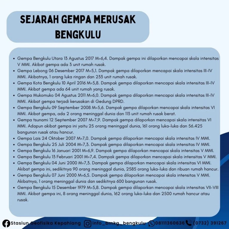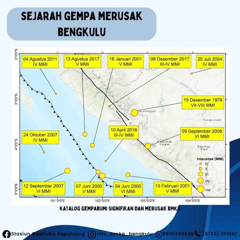 Bengkulu Tengah – Saat ini sedang berkembangnya perbincangan di media nasional mengenai megathrust, BMKG Bengkulu menghimbau masyarakat untuk meningkatkan kewaspadaan potensi gempa bumi pada zona megathrust, dan tidak panik serta tidak terpancing dengan informasi atau isu-isu yang tidak bertanggungjawab dengan selalu memperhatikan informasi dan tanda secara berkala dari BMKG. Mengenai hal tersebut bukanlah peringatan dini atau prediksi, namun mengingatkan adanya keberadaan Zona Megathrust Selat Sunda dan Mentawai-Siberut sebagai zona kekosongan gempa besar (seismic gap) untuk itu perlunya kesiapsiagaan karena segmen-segmen sumber gempa di sekitarnya sudah rilis gempa besar semua, sementara dikedua zona tersebut hingga saat ini belum terjadi. Provinsi Bengkulu terdapat dua segmen potensi gempa bumi yang berkekuatan tinggi yaitu segmen Megathrust Enggano dan segmen Megathrust Mentawai yang berdampak langsung dengan Kabupaten Mukomuko dan Kabupaten Bengkulu Utara. Untuk gempa Megathrust Enggano berpotensi magnitudo maksimal mencapai 8,9 dan potensi pula berdampak tsunami. Sementara itu, untuk wilayah di Bengkulu yang sering terjadi gempa tersebar secara merata seperti dari Kabupaten Mukomuko, Kabupaten Bengkulu Utara, Kabupaten Bengkulu Selatan, Pulau Enggano, dan sebagainya. Provinsi Bengkulu sejak dulu hingga saat ini merupakan daerah potensi gempa bumi dan tsunami, secara histori pada 1818 dan 1833 Kota Bengkulu pernah dilanda tsunami. Hal ini disebabkan, secara geografis Provinsi Bengkulu berhadapan langsung dengan Samudera Hindia dan dilalui zona subduksi megathrust baik di darat maupun lautan terdapat patahan atau sesar. Adapun sesar aktif yang berada di sekitar Bengkulu yaitu Mentawai, Enggano, Ketahun, Musi dan Manna, dengan subduksi bergerak 55 mm/tahun sampai 57 mm/tahun dan pergerakan sesar berkisar 11 mm/tahun. Wilayah Provinsi Bengkulu sejak Januari - 16 Agustus 2024 telah terjadi gempa bumi sebanyak 746 kali dengan gempa paling tinggi terjadi dengan magnitudo 6,3 dan terkecil magnitudo 1,9. Sedangkan untuk wilayah Kabupaten Bengkulu Tengah di seluruh wilayahnya berpotensi gempa bumi dan potensi tsunami pada Kecamatan Pondok Kelapa dan wilayah sekitarnya yang berada di dekat laut. Untuk itu perlunya upaya meminimalisir risiko bencana dan korban jiwa, terutama bagi masyarakat yang berada di wilayah dekat posisi laut atau lintasan megathrust sehingga perlu waspada juga terhadap bencana gempa bumi dan tsunami, mengingat getaran gempa berkekuatan besar dapat menjadi pemicu penyebab tsunami. Dalam menghadapi adanya potensi bencana tersebut, masyarakat diharapkan mempersiapkan upaya mitigasi bencana seperti peningkatan pengetahuan langkah-langkah mitigasi, persiapan tas bencana dan rencana alur evakuasi pada saat bencana.