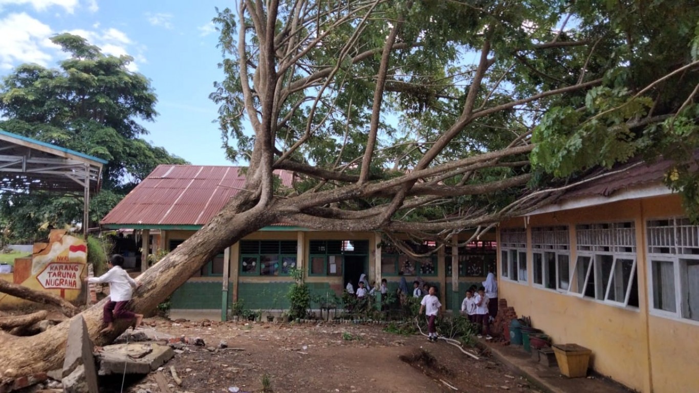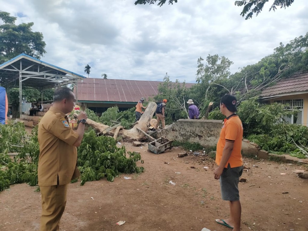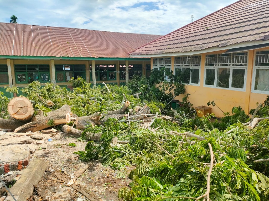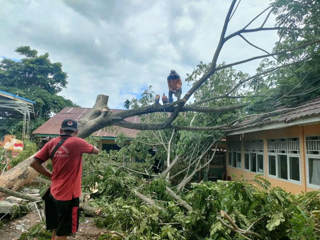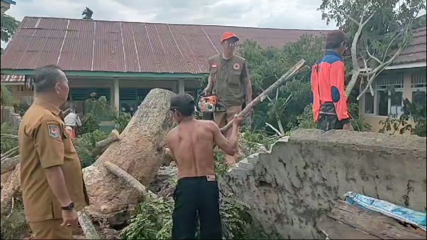 Bengkulu Tengah – Terjadi pohon tumbang akibat angin kencang yang disertai hujan deras pada tanggal 12 Februari 2024. Kejadian pohon tumbang terjadi di SDN 02 Bengkulu Tengah yang berada di Desa Pekik Nyaring Kecamatan Pondok Kelapa Kabupaten Bengkulu Tengah. Adanya kejadian ini Tim BPBD Kabupaten Bengkulu Tengah, baik Satgas, Kepala Pelaksana, maupun Kabid Darurat dan Logistik beserta staf segera menuju lokasi untuk mengevakuasi dan pembersihan pohon tumbang yang dibantu perangkat desa dan masyarakat sekitar. Pohon tumbang ini mengakibatkan kerusakan ringan pada pagar dan atap sekolah, dan tidak menyebabkan korban jiwa, serta kegiatan belajar mengajar masih dapat berlangsung dengan lancar.