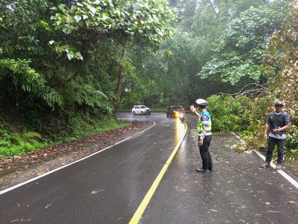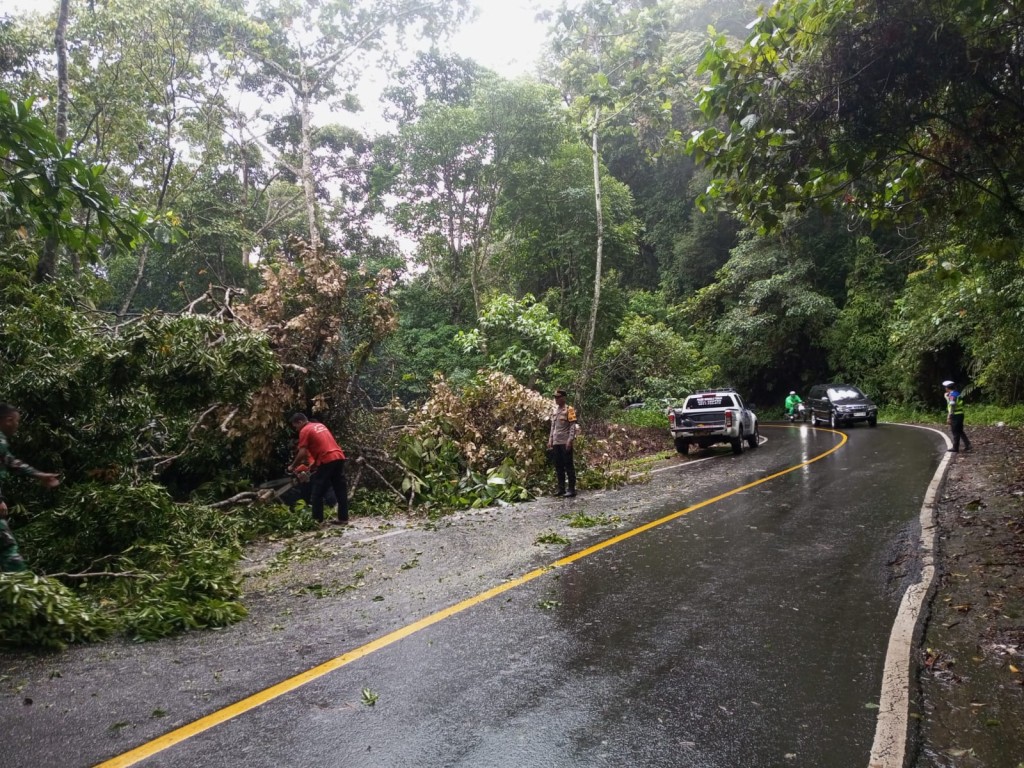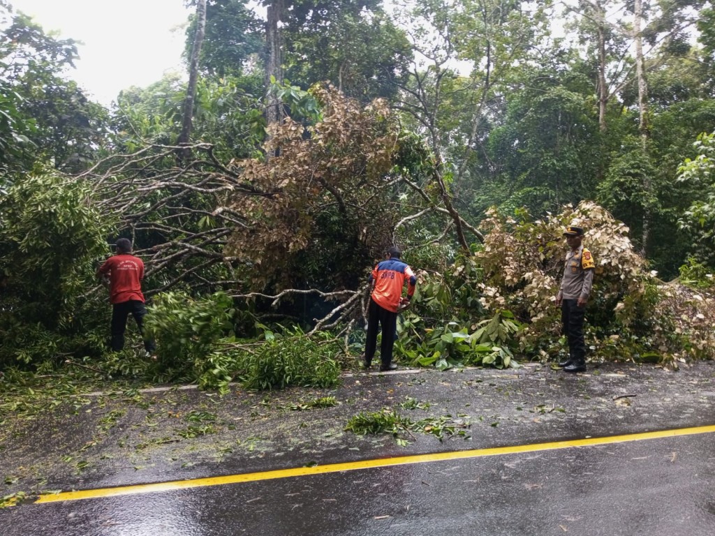 Bengkulu Tengah – Terdapat 1 titik lokasi kejadian pohon tumbang akibat hujan lebat dan disertai angin kencang yang terjadi di Jalan Nasional Kawasan Liku Sembilan KM 45 (Jalan Lintas Kota Bengkulu – Kabupaten Kepahiang), Kecamatan Taba Penanjung, Kabupaten Bengkulu Tengah pada Jumat (02/01/2026) sekitar pukul 09.30 WIB. Pohon yang tumbang menghalangi setengah badan jalan dan membuat arus lalu lintas terganggu. Setelah mendapat informasi kejadian, BPBD Kab. Bengkulu Tengah menurunkan tim satgas menuju lokasi kejadian untuk segera dilakukan penanganan berupa pemotongan pohon menggunakan chainsaw serta pembersihan material sisa pohon tumbang bersama Polri dan TNI. Penanganan evakuasi pohon tumbang yang saat ini sudah selesai dan arus lalulintas berjalan normal kembali dan nihil korban jiwa.