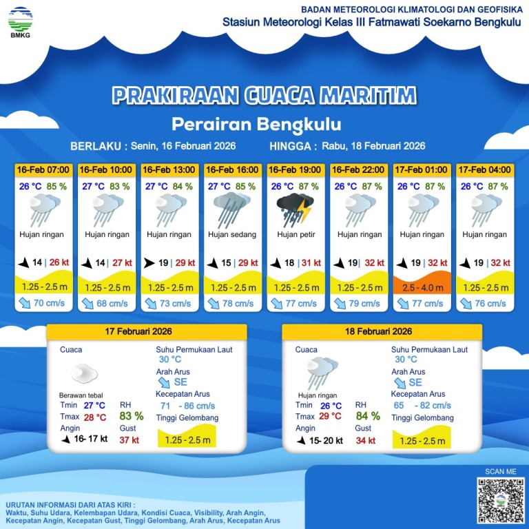 Berikut prakiraan cuaca hari Senin, 16 Februari 2026.