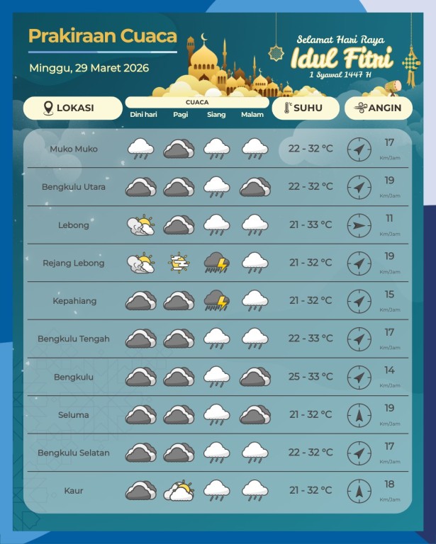 Berikut prakiraan cuaca hari Minggu, 29 Maret 2026.
