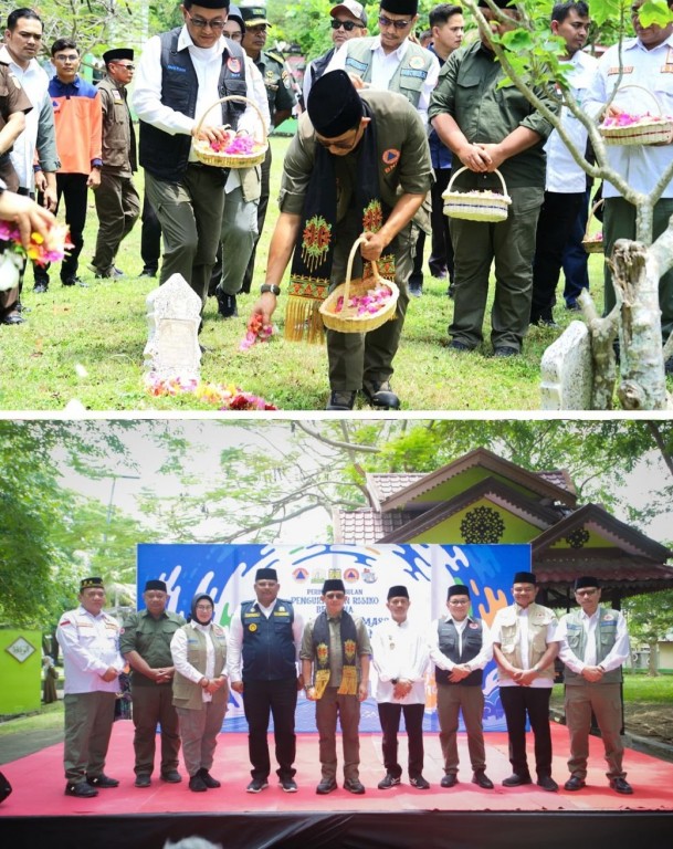 Banda Aceh – BPBD Kabupaten Bengkulu Tengah menghadiri rangkaian peringatan Bulan Pengurangan Risiko Bencana (PRB) Tahun 2024 dengan agenda ziarah dan tabur bunga ke kuburan massal korban bencana tsunami Tahun 2004 di Kawasan Desa Ulee Lheu, Banda Aceh pada Rabu (09/10/2024). Kegiatan ziarah dan tabur bunga serta doa bersama bagi korban bencana tsunami Tahun 2004 ini dihadiri Kepala Badan Nasional Penanggulangan Bencana (BNPB) Letnan Jenderal TNI Dr. Suharyanto, S.Sos., M.M bersama jajaran. Kepala BNPB menyampaikan secara histori Provinsi Aceh memiliki kerawanan bencana gempa dan tsunami yang tinggi, sehingga menjadi fokus utama dalam upaya penanggulangan bencana di Indonesia. Hal ini penting menjadi pembelajaran dari pengalaman bencana agar meminimalkan risiko bencana dengan meningkatkan kesadaran dan kesiapsiagaan masyarakat dalam upaya mempersiapkan langkah-langkah pencegahan dan mitigasi bencana.