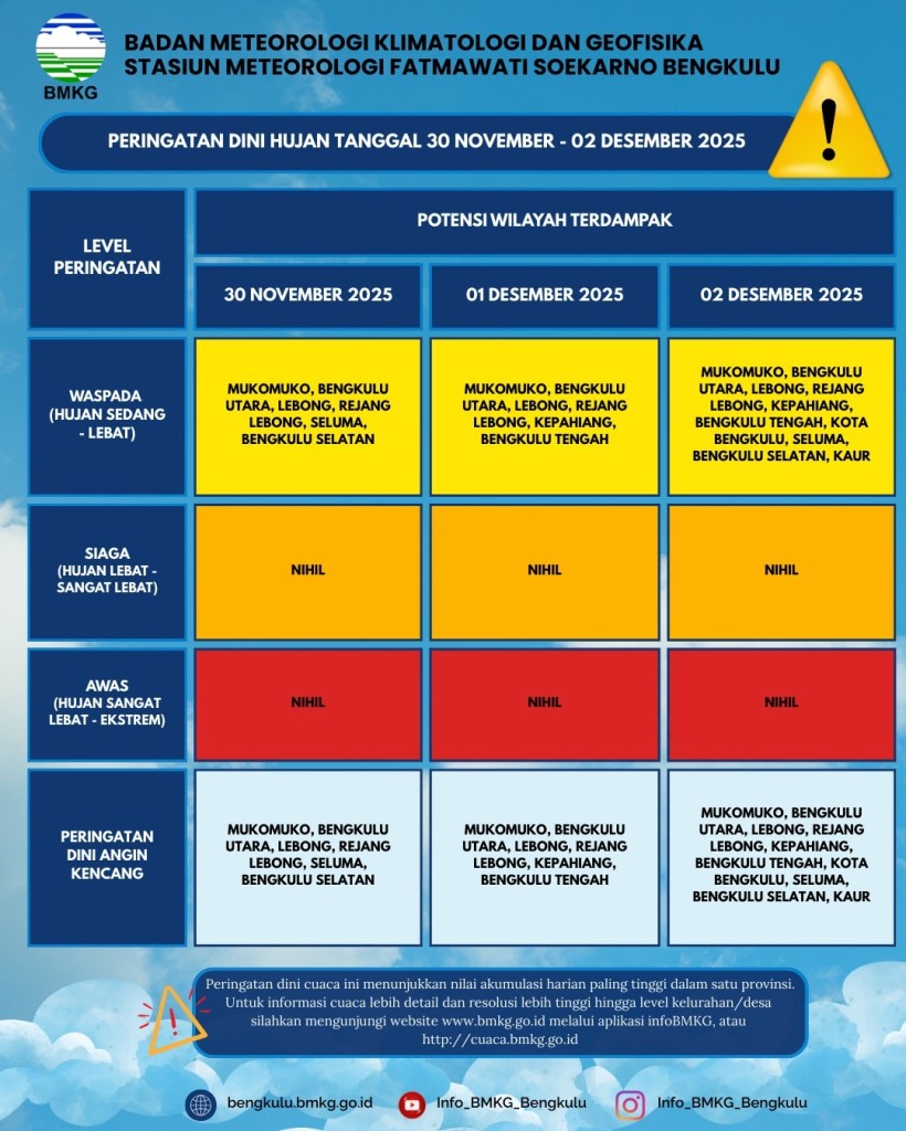 Prakiraan Cuaca Wilayah Kab. Bengkulu Tengah 01 Desember 2025